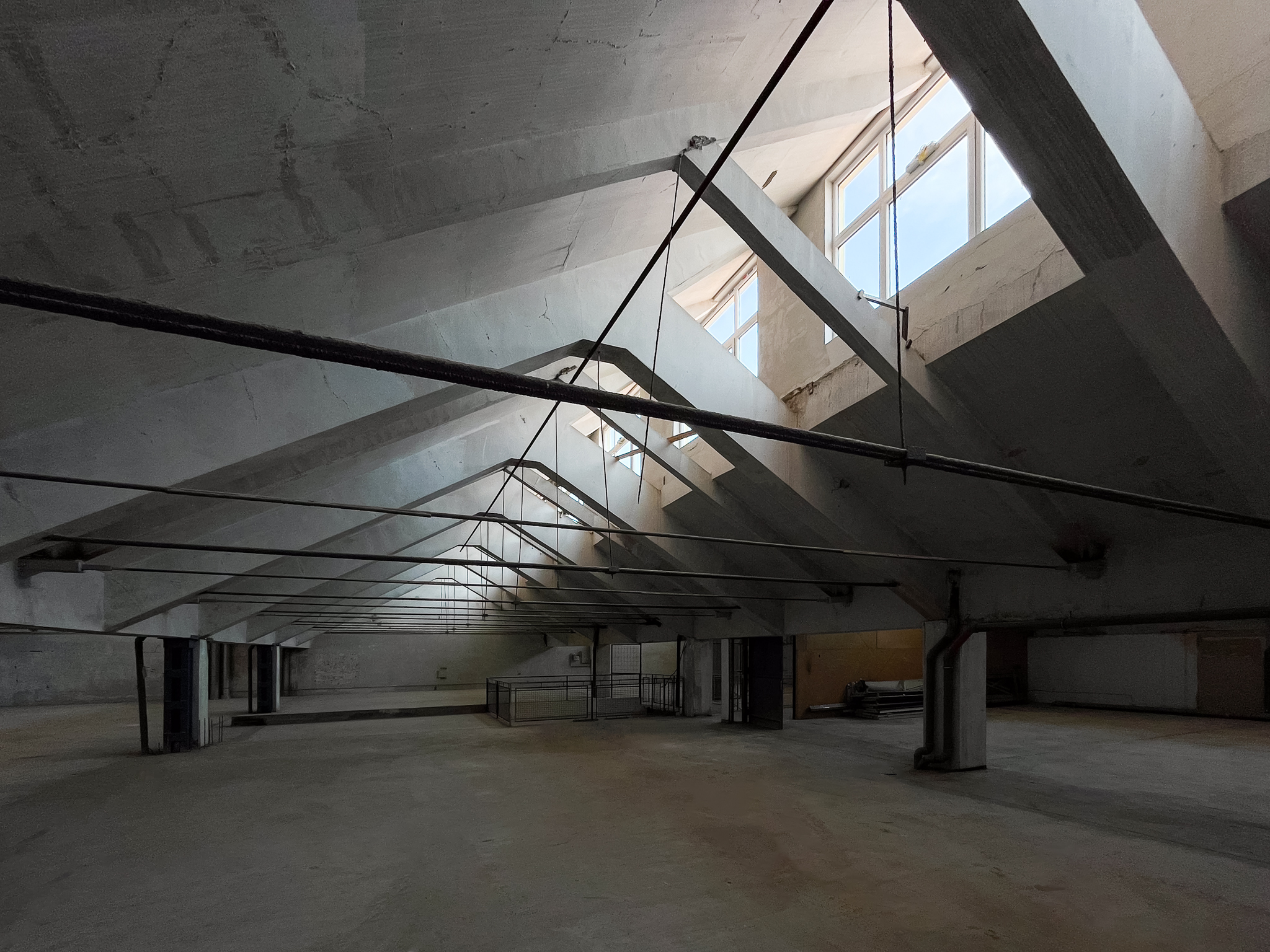 Ipari műemlék jellegű alul bordás vasbeton héjszerkezet felújított sheed-tetős távnyitós felülvilágító ablakokkal.