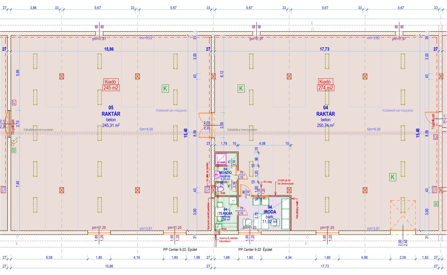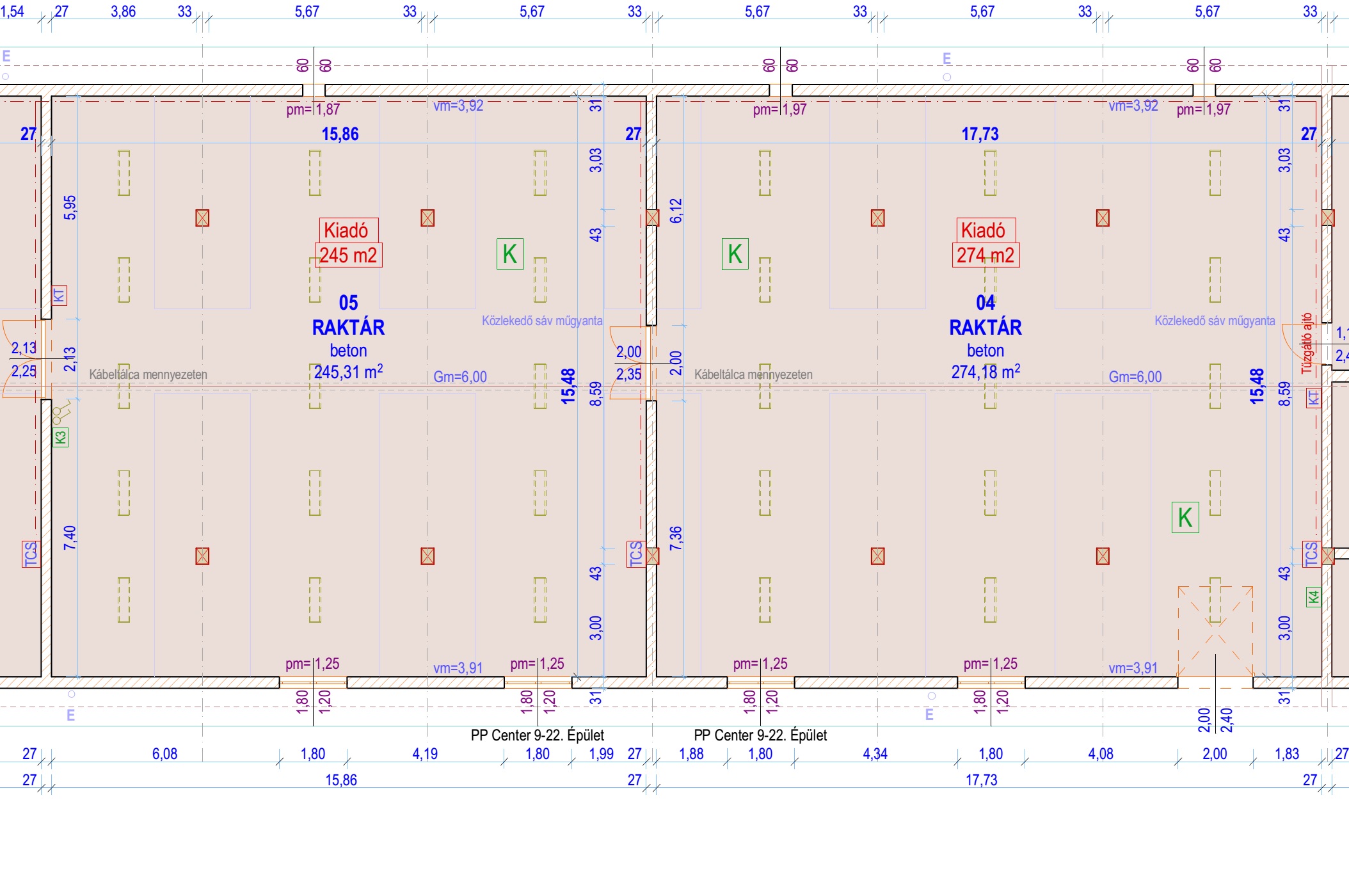 15,5 m széles 4-6 m belmagas raktár terek  2x2,4 m  szekcionált kapu bejáratokkal.